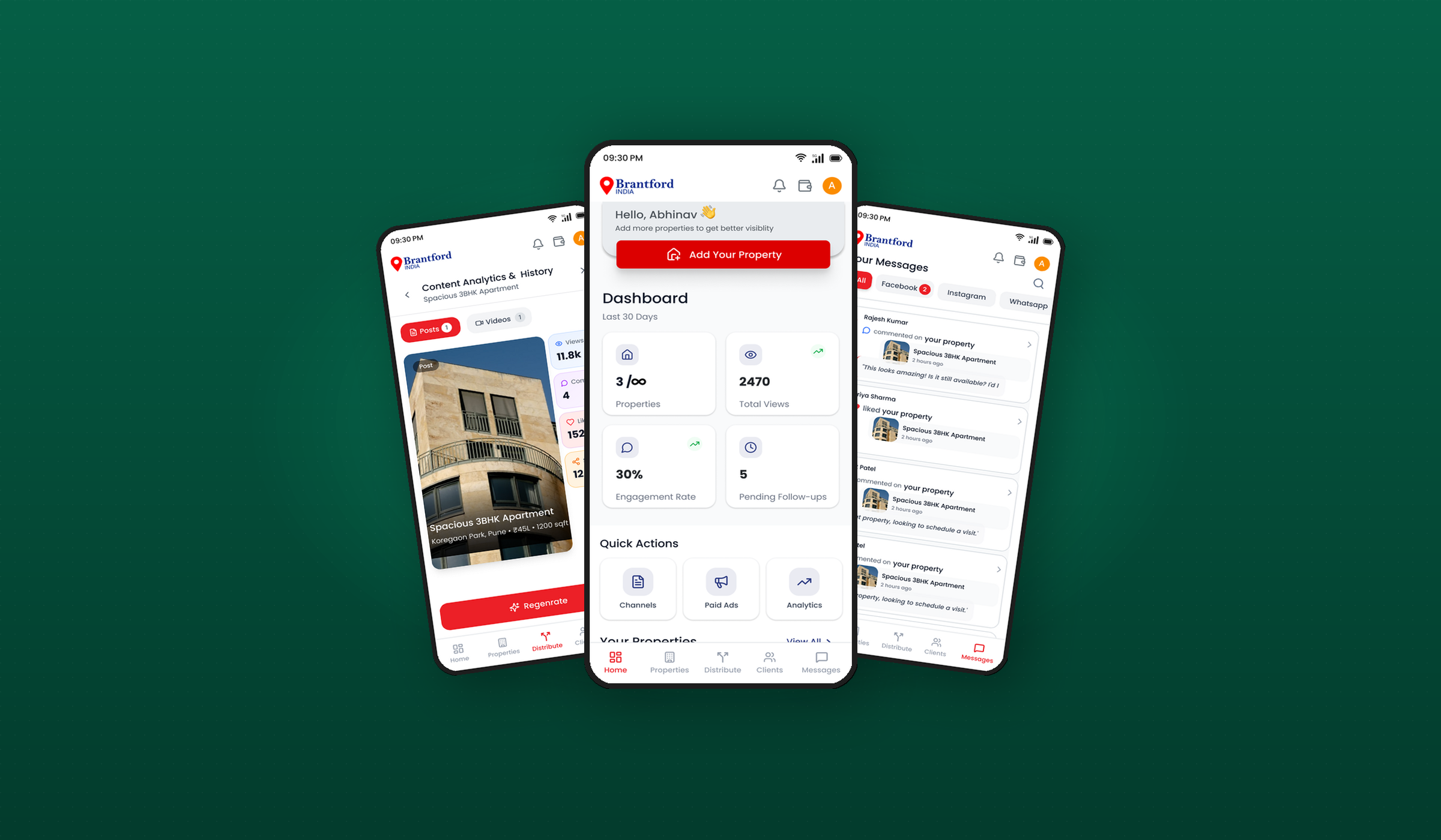 Brantford India was designed as a mobile-first business engine where realtors manage their entire operation from one app. Property creation accepts any format — photos, voice notes, WhatsApp messages, PDFs — and AI automatically generates clean, professional listings. One-tap distribution pushes properties across WhatsApp, SMS, Telegram, social media, and Google Business with built-in spam prevention. Every enquiry from every channel flows into a unified timeline. Follow-ups trigger automatically based on realtor-defined rules. The web dashboard mirrors all functionality for desktop workflows while the mobile app remains the primary surface.